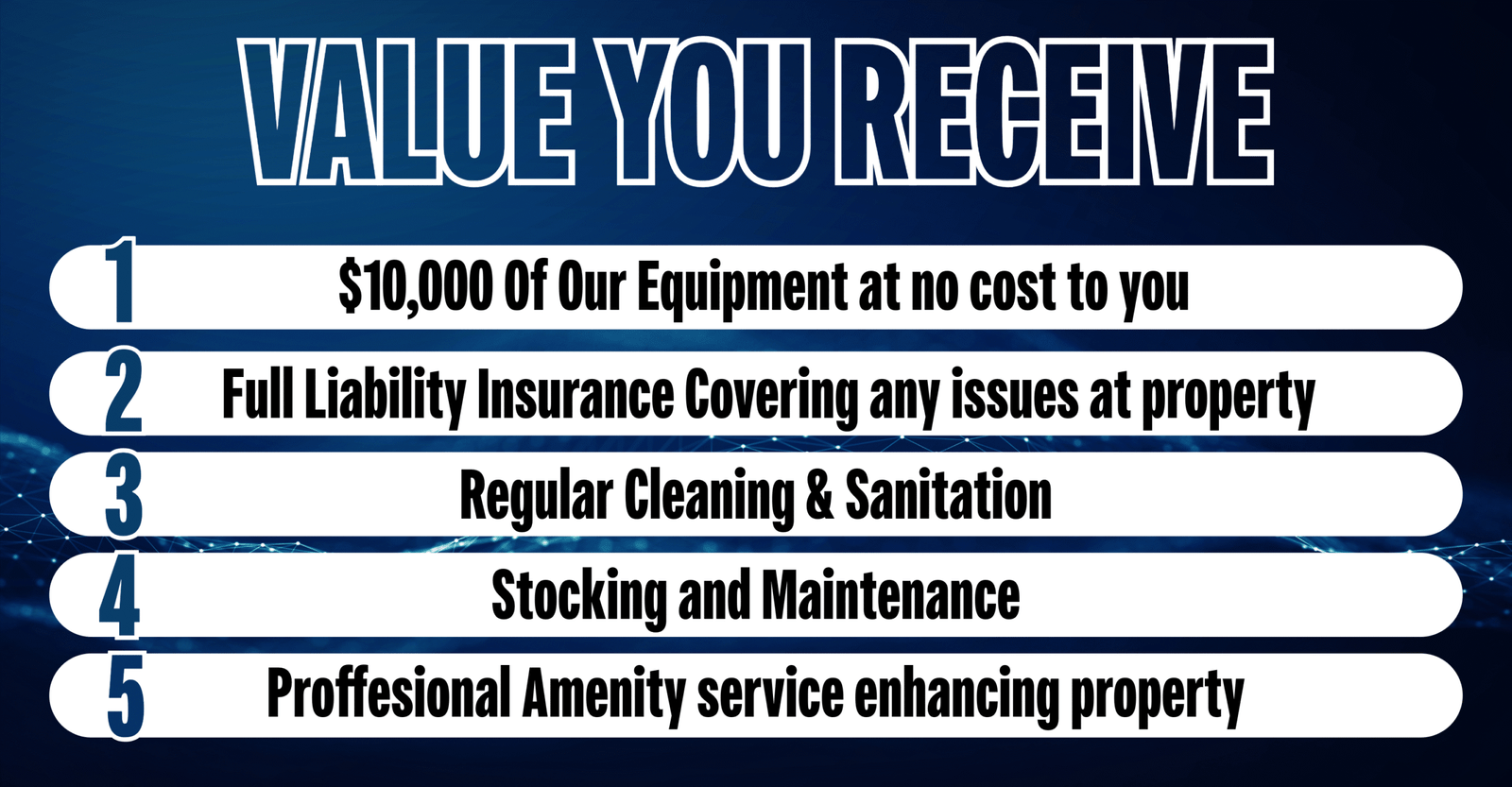 We handle every aspect. You don’t pay Installation, the machines, repairs, or inventory. We got it all covered.